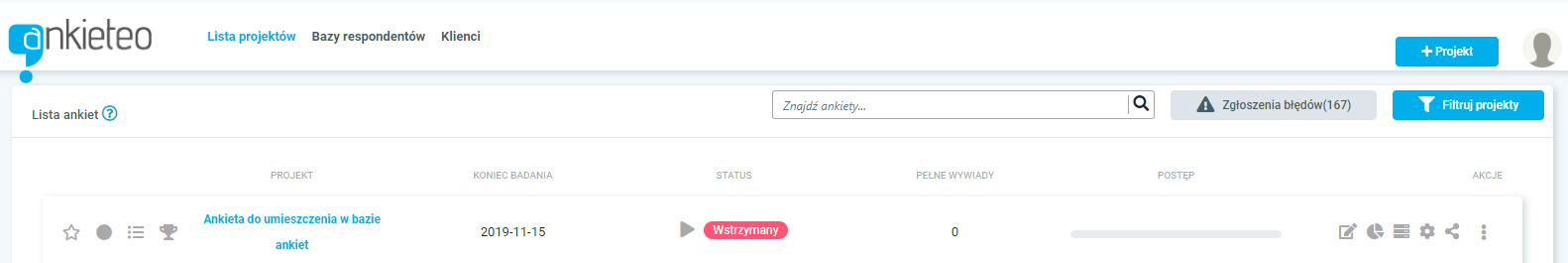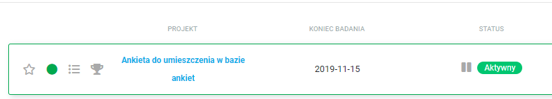 | Tytuł ankiety | Data dodania | Status | Wywiady | Cash Points | Social Points | Akcje | Średnia ocena respondentów (ilość ocen) |